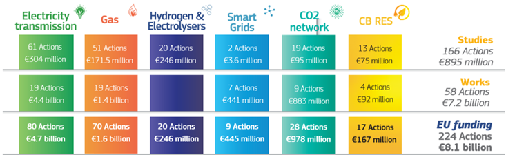Afin de mener à bien ces objectifs, le CINEA supporte des activités de plusieurs natures : les travaux d’études de faisabilités, des travaux cadrage, voir de prototypage, ou projet pilotes, ou encore le passage de Jalon FID/FEED… (Studies) et les travaux d’infrastructures et d’opérations non viable sans support (Works). Face aux enjeux énergétiques européens et le besoin de décarboner, différents vecteurs énergétiques sont soutenus au travers du portefeuille.